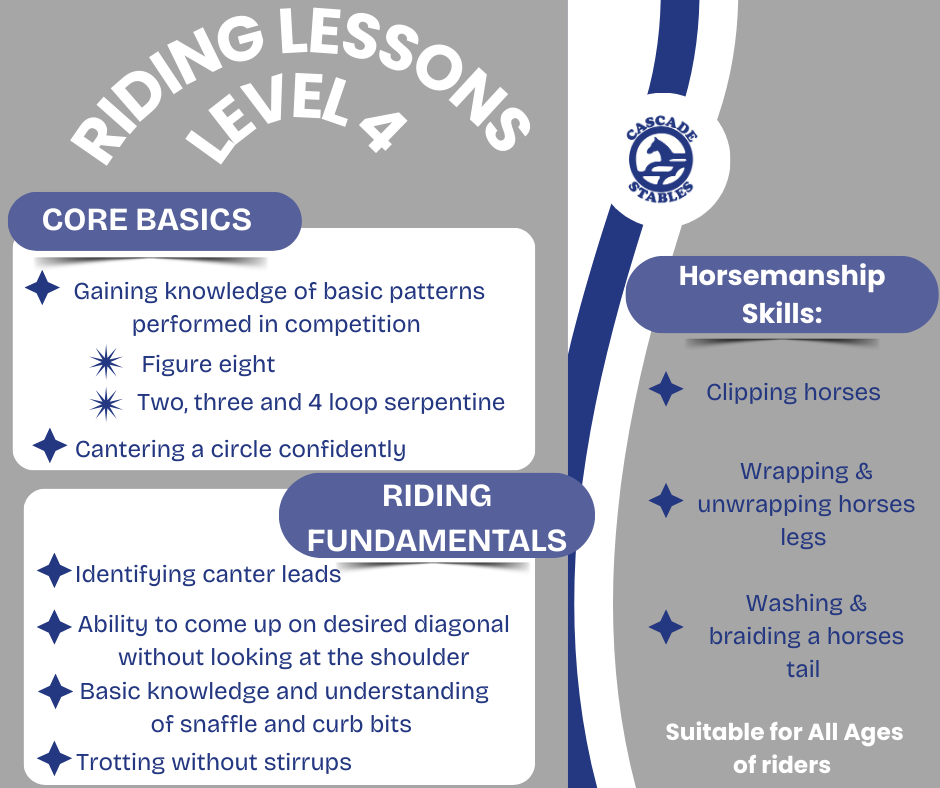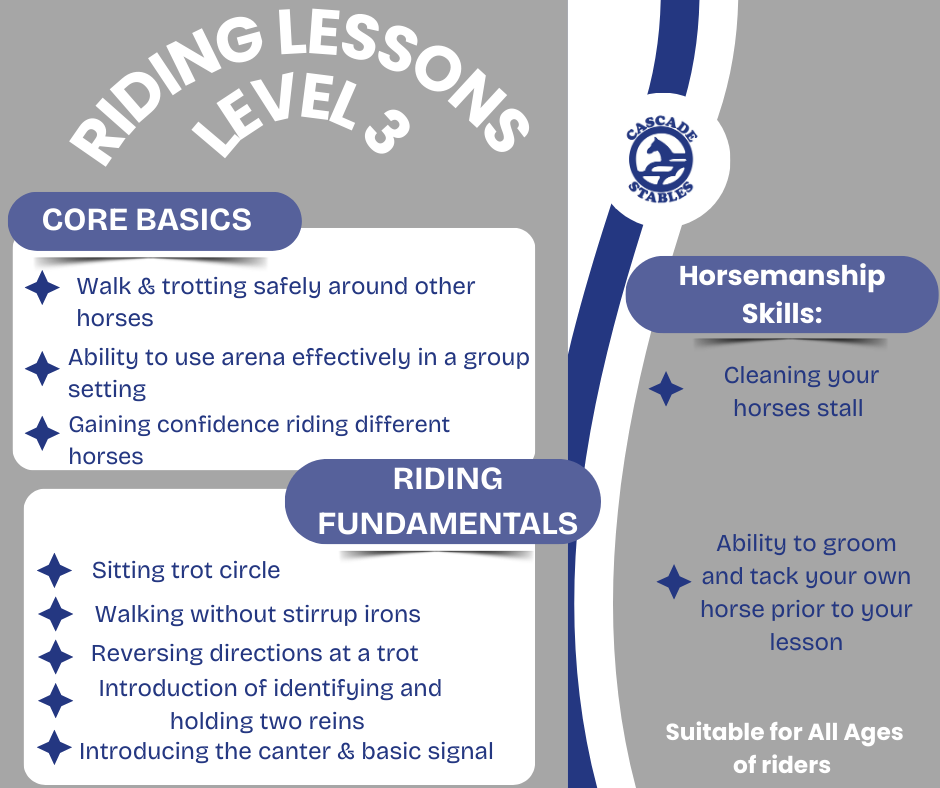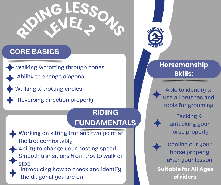 All lessons are in the riding arena with an instructor and start promptly at the scheduled time. In order to provide all riders with their full lesson, we are unable to adjust lesson times due to tardiness. We appreciate your cooperation.